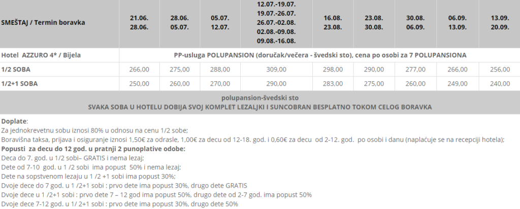 NAPOMENA: boravak na bazi minimum 7 noćenja ili više sa uslugom naznačenom u tabeli od vremena ulaska u hotel , studiu ili apartmanu do vremena njihovog napuštanja, a u zavisnosti od pravila (u najvećem broju hotela ulazak u sobe studio/apartman je posle 14:00 h, a iste se poslednjeg dana boravka napuštaju najkasnije do 10:00 časova).