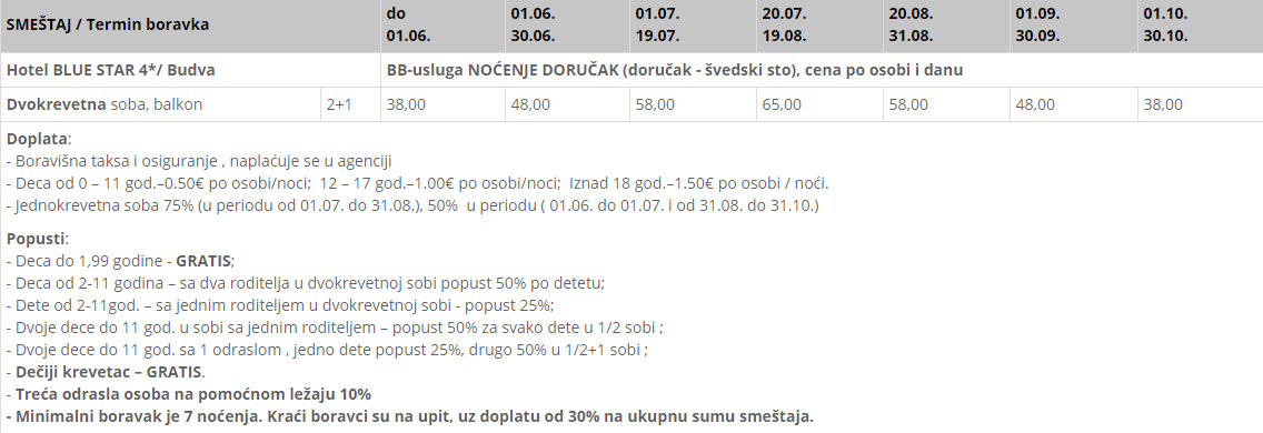 NAPOMENA: boravak na bazi minimum 7 noćenja ili više sa uslugom naznačenom u tabeli od vremena ulaska u hotel , studiu ili apartmanu do vremena njihovog napuštanja, a u zavisnosti od pravila (u najvećem broju hotela ulazak u sobe studio/apartman je posle 14:00 h, a iste se poslednjeg dana boravka napuštaju najkasnije do 10:00 časova).