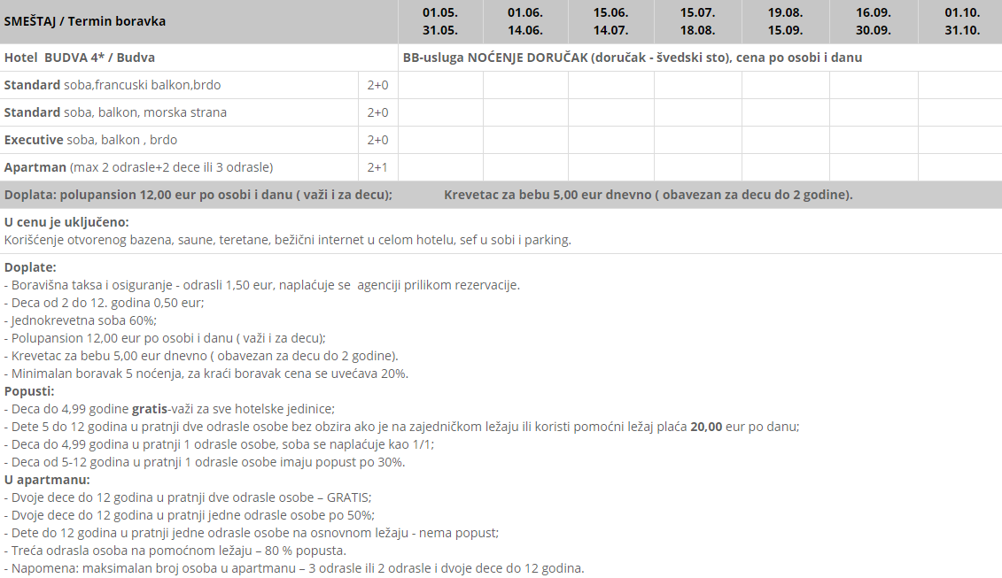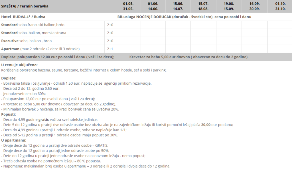 NAPOMENA: boravak na bazi minimum 7 noćenja ili više sa uslugom naznačenom u tabeli od vremena ulaska u hotel , studiu ili apartmanu do vremena njihovog napuštanja, a u zavisnosti od pravila (u najvećem broju hotela ulazak u sobe studio/apartman je posle 14:00 h, a iste se poslednjeg dana boravka napuštaju najkasnije do 10:00 časova).