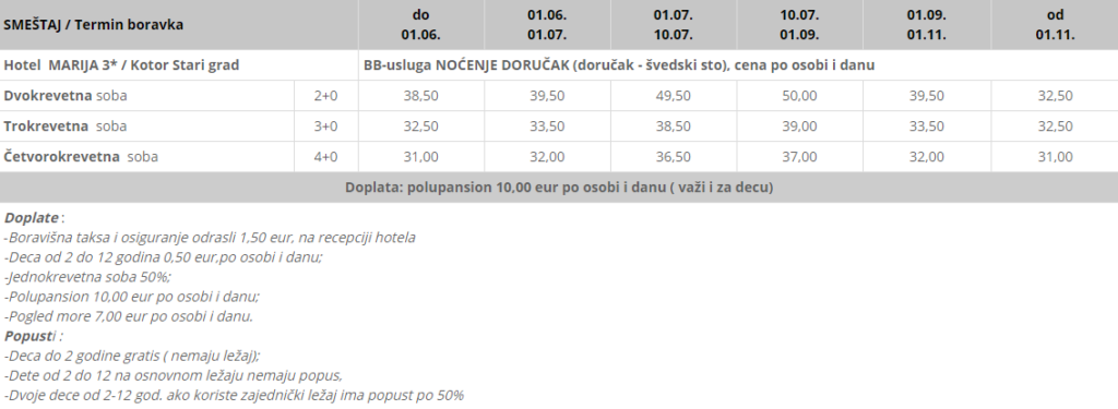 NAPOMENA: boravak na bazi minimum 7 noćenja ili više sa uslugom naznačenom u tabeli od vremena ulaska u hotel , studiu ili apartmanu do vremena njihovog napuštanja, a u zavisnosti od pravila (u najvećem broju hotela ulazak u sobe studio/apartman je posle 14:00 h, a iste se poslednjeg dana boravka napuštaju najkasnije do 10:00 časova).