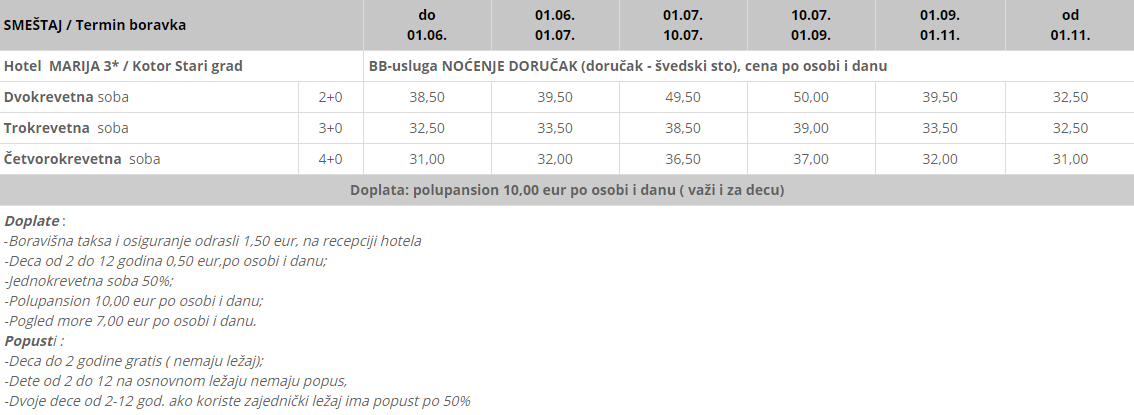 NAPOMENA: boravak na bazi minimum 7 noćenja ili više sa uslugom naznačenom u tabeli od vremena ulaska u hotel , studiu ili apartmanu do vremena njihovog napuštanja, a u zavisnosti od pravila (u najvećem broju hotela ulazak u sobe studio/apartman je posle 14:00 h, a iste se poslednjeg dana boravka napuštaju najkasnije do 10:00 časova).