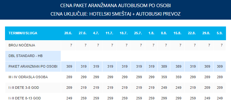 CENA PAKET ARANŽMANA: cena je po osobi, naznačena je u tabeli u EUR (dinarsko plaćanje), za svaki termin, objekat i uslugu.