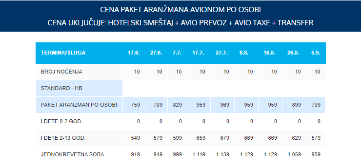 HOTELSKE SKRAĆENICE I NAZNAKE U TABELI: standardna soba – dva standardna ležaja ili francuski (široki) ležaj + pomoćni ležaj; BB – bed&breakfast (noćenje i doručak – samoposluživanje); HB – halfboard (polupansion: doručak, večera – samoposluživanje – izbor više jela); AI – All Inclusive (sve uključeno: doručak, ručak, večera + dodatna usluga: slatka i slana užina, bezalkoholna i alkoholna pića prema hotelskom planu – detalji na sajtu); GV – garden view – pogled na park;