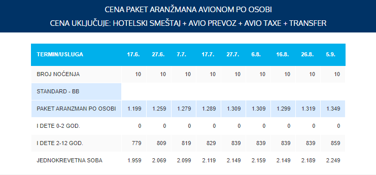 JEDINSTVENA CENA PAKET ARANŽMANA – AVIONOM OBUHVATA: