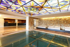 Hotelski sadržaj: bazen sa delom za decu i sunčanom terasom sa ležaljkama i suncobranima i pool barom, unutrašnji bazen, restoran sa pogledom na more, 3 bara sa različitim ambijentima, spa & wellness, zabavni vodeni tobogan, fitnes centar, mini golf, teniski teren.
