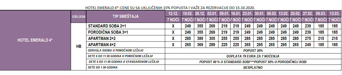 - Doplata za novogodišnju večeru (nije obavezna): odrasli 60 eur / deca (do 12.99 god) 40 eur.