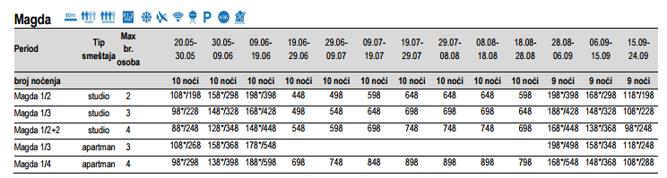 Vrste smeštaja: STU – studio (u jednoj prostoriji kuhinja i kreveti), APP – apartman (kuhinja odvojena vratima od spavaće sobe), DUP – duplex (apartman sa dve spavaće sobe), MEZ – mezoneta (apartman na dva nivoa