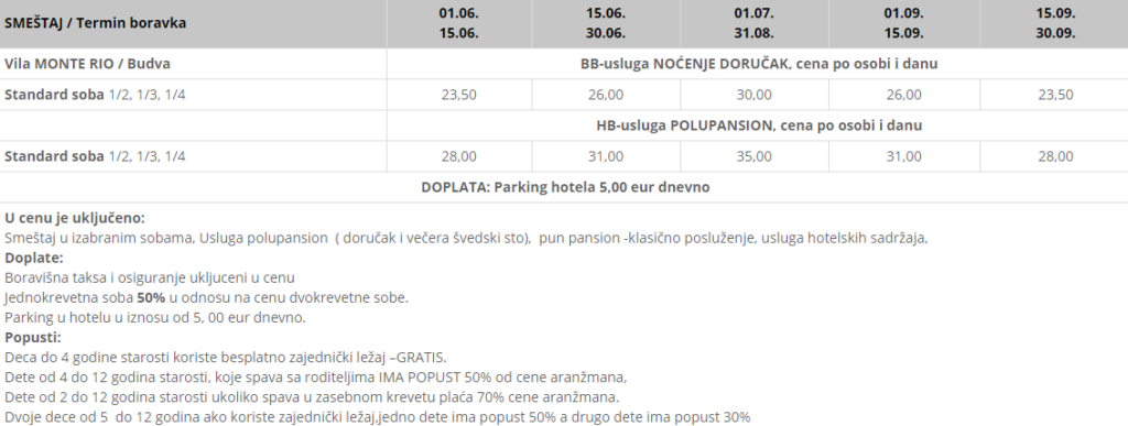 NAPOMENA: boravak na bazi minimum 7 noćenja ili više sa uslugom naznačenom u tabeli od vremena ulaska u hotel , studiu ili apartmanu do vremena njihovog napuštanja, a u zavisnosti od pravila (u najvećem broju hotela ulazak u sobe studio/apartman je posle 14:00 h, a iste se poslednjeg dana boravka napuštaju najkasnije do 10:00 časova).