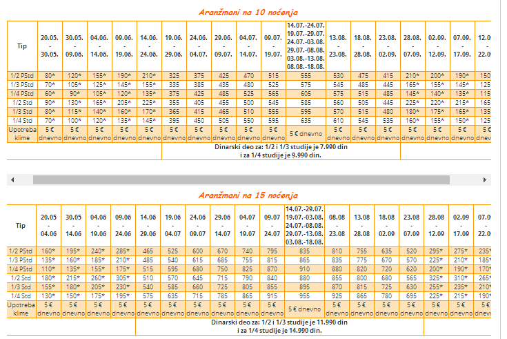 Legenda: 1/2 Std – Dvokrevetni studio; 1/3 Std – Trokrevetni studio; 1/4 Std – Četvorokrevetni studio;1/2 Pstd – Dvokrevetni studio u prizemlju; 1/3 Pstd – Trokrevetni studio u prizemlju; 1/4 PStd – Četvorokrevetni studiou prizemlju- Cene označene zvezdicom (*) su cene paket aranžmana (dinarski deo, smeštaj, prevoz ali bez teritorijalne doplate za prevoz, tabela ispod) po osobi