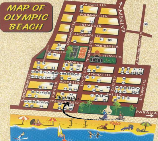 Olympic Beach je manje i mirnije mesto od susedne Paralije, ali turistima neće nedostajati ni restorani, ni super marketi kojih ima u izobilju. Centar letovališta krasi lep park, koji sa jedne strane uokviruje plaža, a sa druge restorani, kafići i poslastičarnice. Deca će uživati u ovom parku, pošto je ovde i igralište.